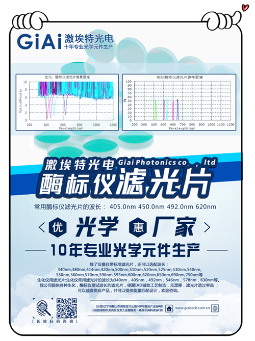 酶標(biāo)儀用濾光片:?IAD硬膜構(gòu)成,無(wú)漂移,可靠耐用。多種規(guī)格、尺寸適用于國(guó)內(nèi)外各知名品牌酶標(biāo)儀。