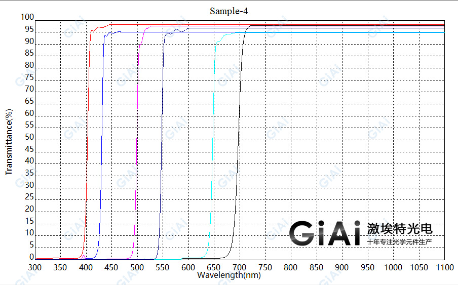 ? ???與傳統(tǒng)的有色光學玻璃濾光片相比, 我公司生產(chǎn)的短波通及長波通濾光片具有截止陡度大、透過率高以及背景光密度大的優(yōu)勢,而且同傳統(tǒng)光學玻璃的方法完全不同的一點,當入射角變化時(從0度向大角度轉(zhuǎn)動),特征截止波長將會向短波方向移動。這個功能可以應用在系統(tǒng)微調(diào)方面,并能夠得到您所需的波長。